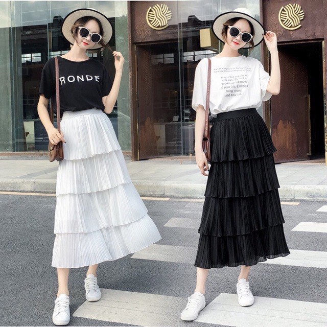 Freeship- Chân váy dài 4 tầng ulzzang công sở hàn quốc vintage dài qua gối lưng cao dáng xòe midi màu Đen/Trắng Freesize mua tại đây